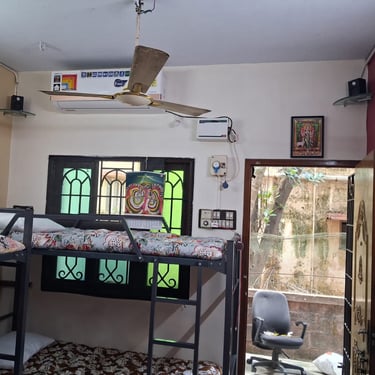 That sounds like a comfortable and well-equipped paying guest (PG) accommodation in Nanganallur, Chennai! The amenities you listed—separate beds, AC, TV, music system, Wi-Fi, washing machine, RO water filter, 24-hour metro water supply, Power backup, geyser, and mosquito nets—cover all the essentials for a convenient stay.